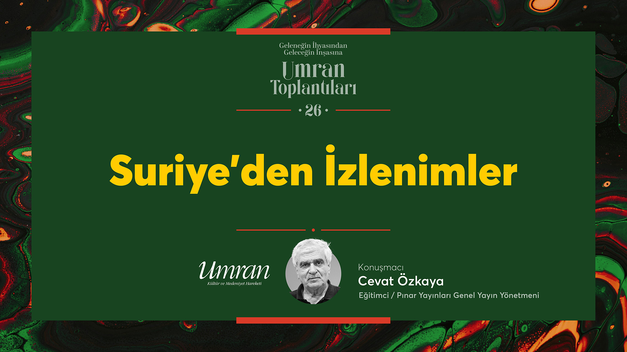 Pınar Yayınları Genel Yayın Yönetmenliği görevini yıllardır sürdüren Cevat Özkaya ile Suriye’den İzlenimler konulu bir konferans gerçekleştireceğiz. Ayağının tozuyla bölgeden yeni dönen Özkaya’nın, gözlemlerini, halkın durumunu ve irtibat kurduğu yerel kaynaklardan edindiği bilgileri aktaracağı bu özel programa icabet etmenizi bekliyoruz…